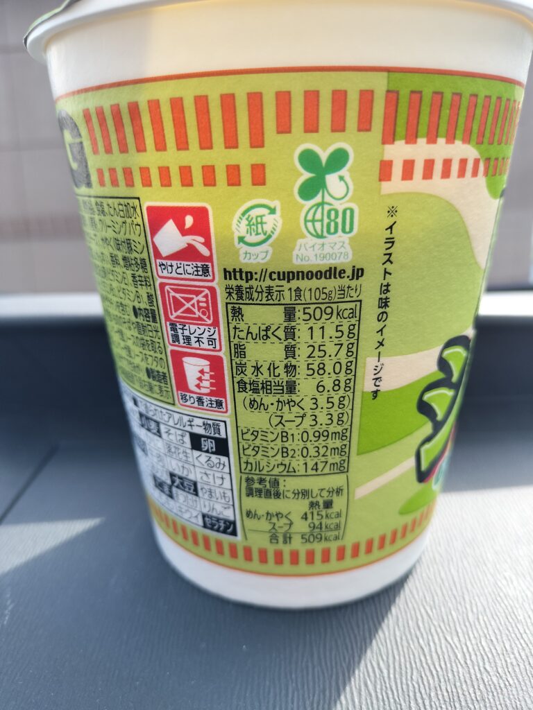 なんか臨場感がある成分表の写真が取れてました。ここで気になるのはかやくの所に「トマト加工品」ここに日清のやる気が感じますね。