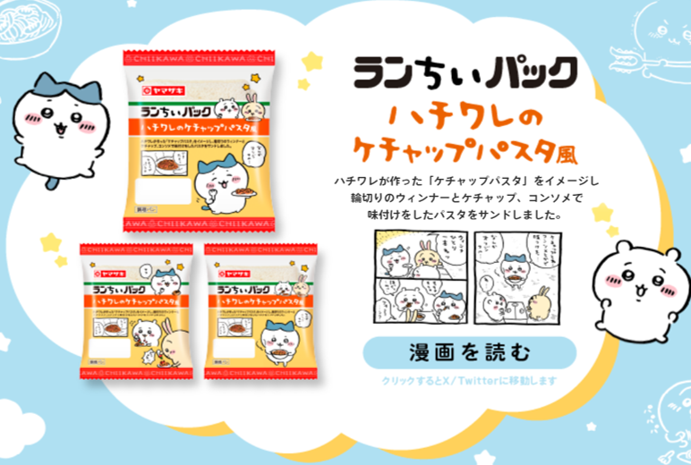 | 商品特徴 | 輪切りのウインナーとケチャップ、コンソメで味付けをしたパスタをサンドしたランチパック。「ちいかわ」に登場するキャラクターのハチワレが作った「ケチャップパスタ」をイメージ |