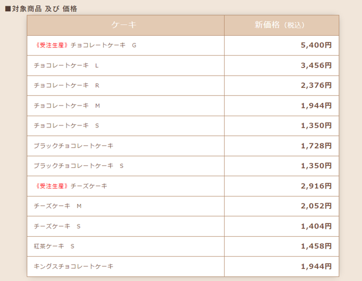 定番のチョコレートケーキの価格を値上げ前後で比較した所、サイズによってばらつきはあるものの100~500円程の値上がりとなっていました。